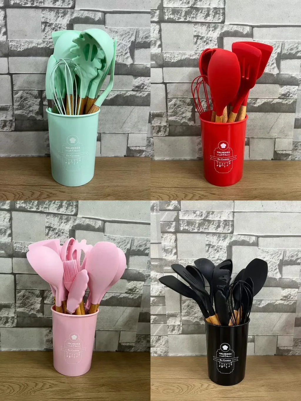 The 12-piece UTENSILS SET has a HIGH LEVEL manufacturing, withstands temperatures up to 230 ° C, ultras resistant cables of ecological Woods, does not RISCAM YOUR PANELS and does not harm Teflon, super easy to wash, durability guaranteed, it is BPA free and gives that luxurious charm to your kitchen. It has holes that can be hung wherever you want and accompanies a beautiful bucket if you want to leave all together. PRINT ALL.