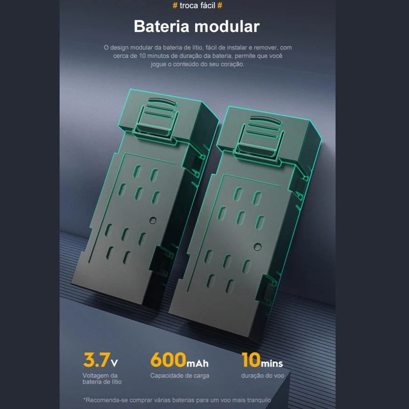 - Bateria modular de 3.7V 600mAh, fácil de instalar e tomar, duração da bateria de até 10 minutos.